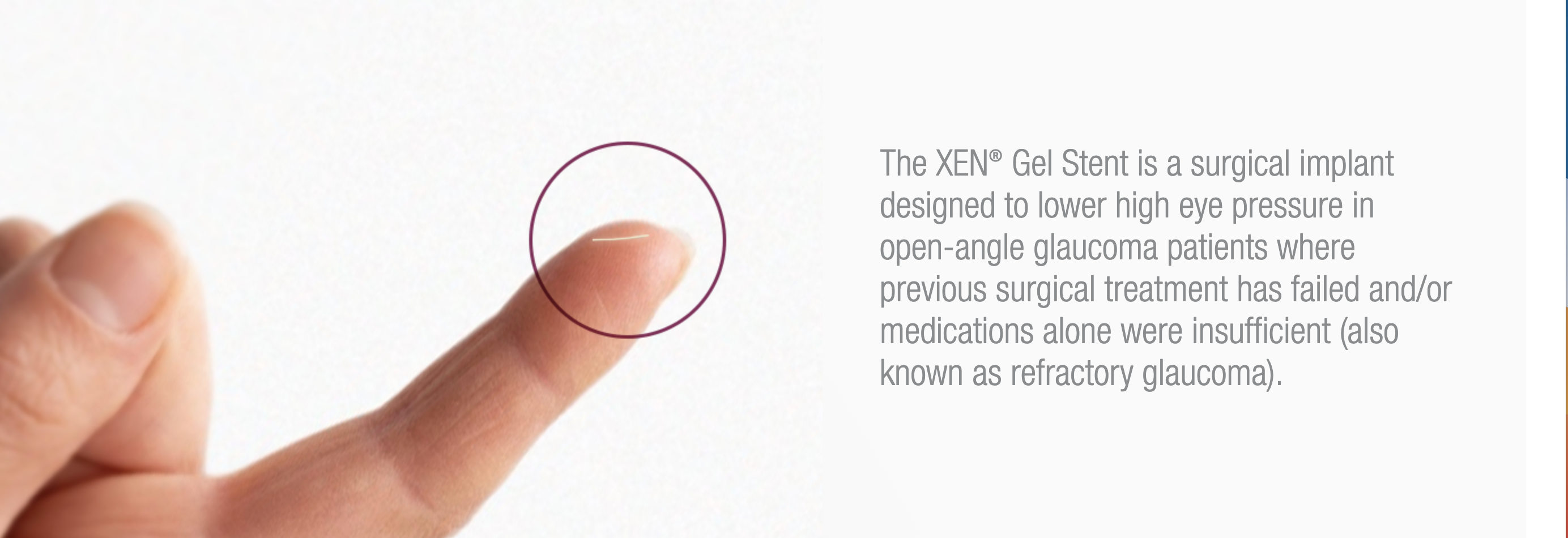 Among the surgeries performed to treat glaucoma is the use of the Xen Gel Stent, a cutting edge medical implant designed for use with minimally invasive glaucoma surgery. The stent creates a small channel in the eye to help drain excess fluid to maintain a healthier eye pressure.